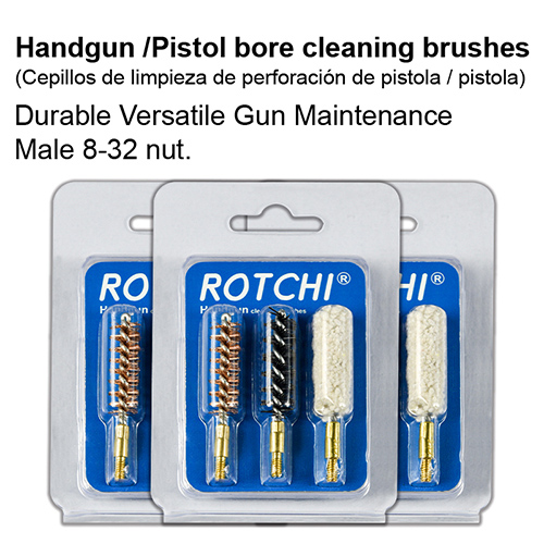 Käsipistoolipesän puhdistusharja 3-in-1 setti, läpipainopakkaus ja kortti paketti. Saatavilla olevat koot: .22, 9mm, .40, .45cal.