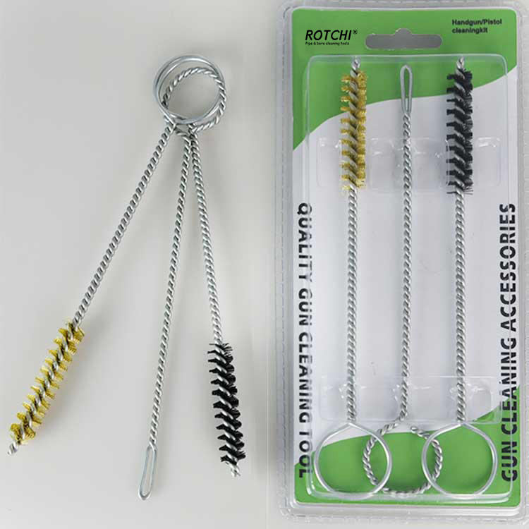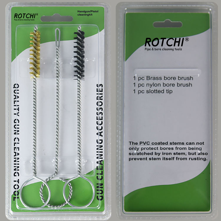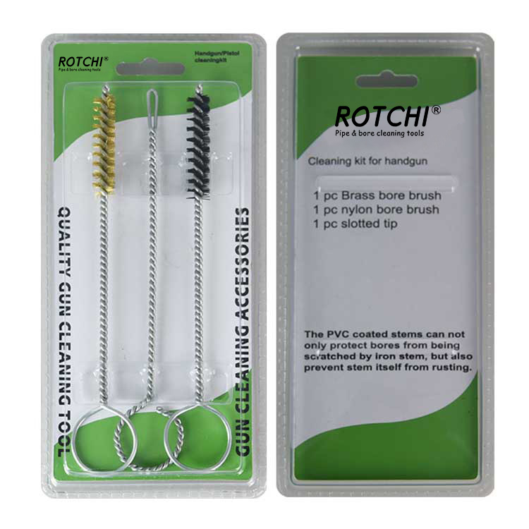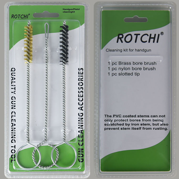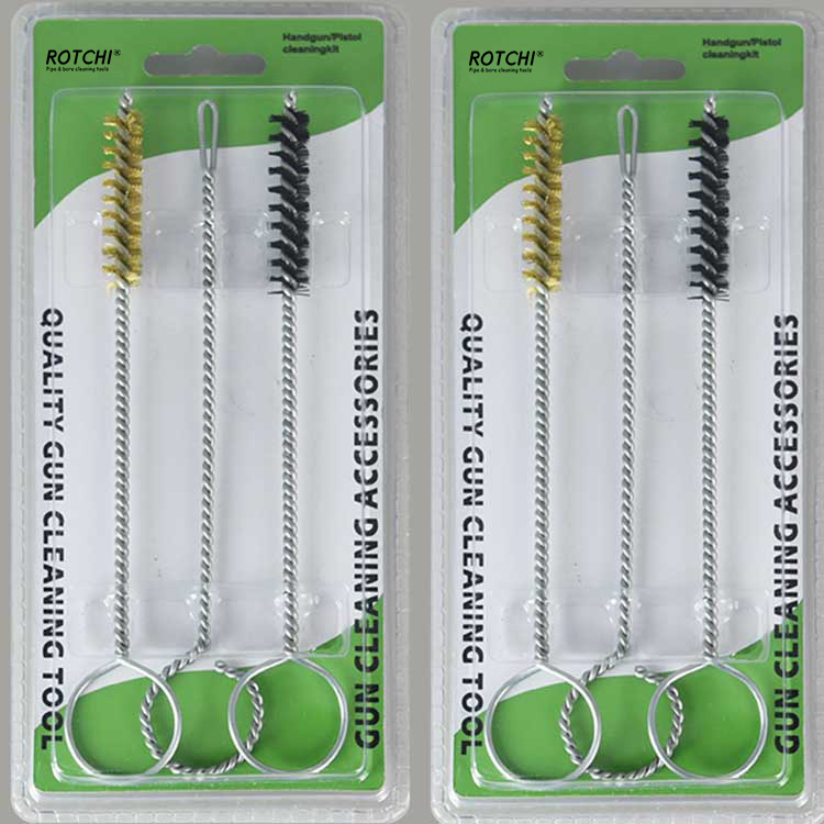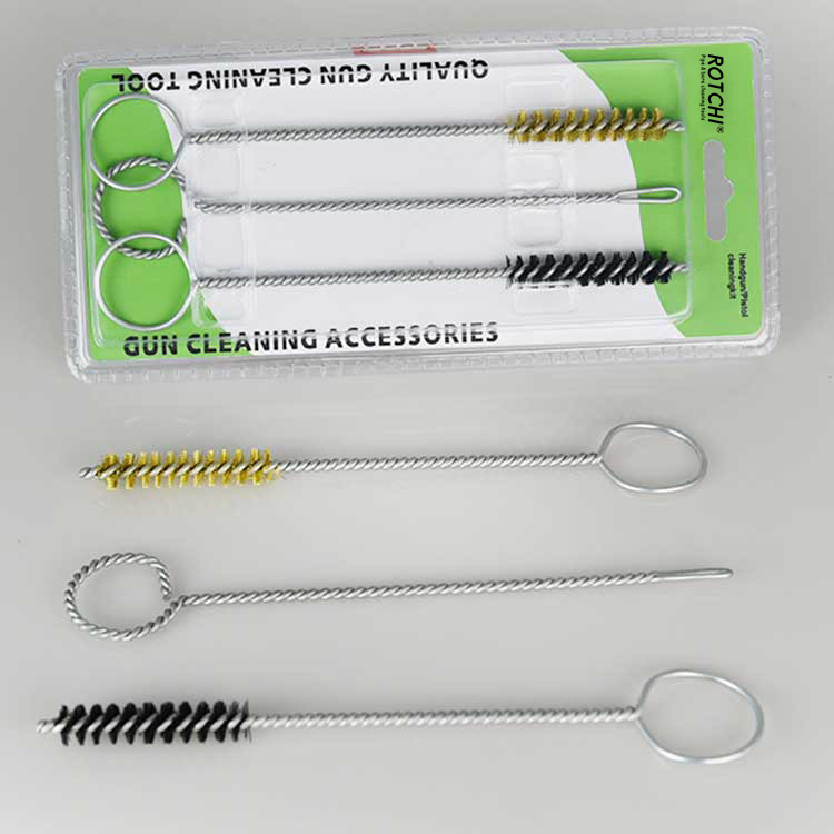 9 mm:n käsiaseiden puhdistussarja läpipainopakkaus 3 kpl sethandgun puhdistussarja, pakattu kaksoisläpipainopakkaukseen. Yksi messinkireikäinen puhdistusharja, yksi nylonreikäinen puhdistusharja ja yksi rakoinen laastarin pidike. Kätevä ja tehokas.