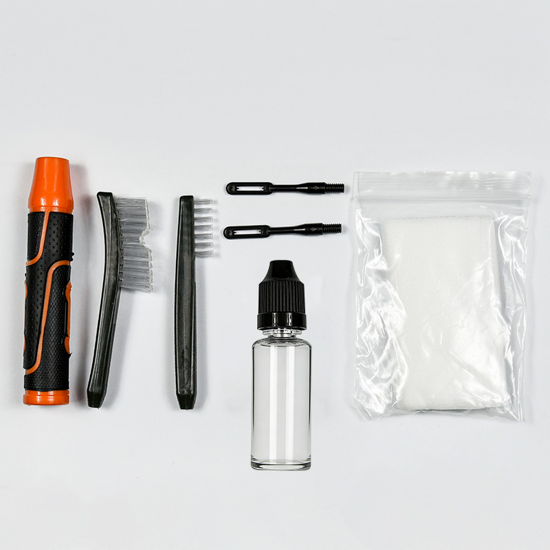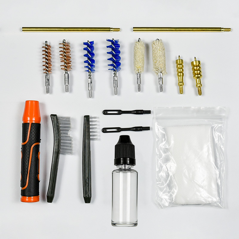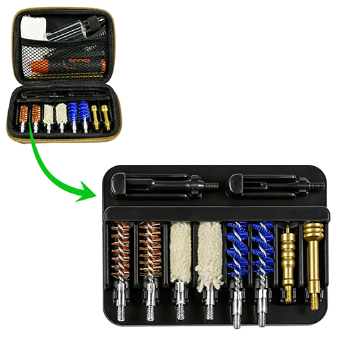 Käsiaseiden puhdistussarja sisältää 2 kokoa (9mm & 0,45 cal.). OX-kankaalla päällystetty PVC-kotelo vetoketjulla. Messinkiharjat, puuvillamopit, nylonharjat, messinkiharjat, 2 sauvaa. Hiekka ja musta väri valinnat.