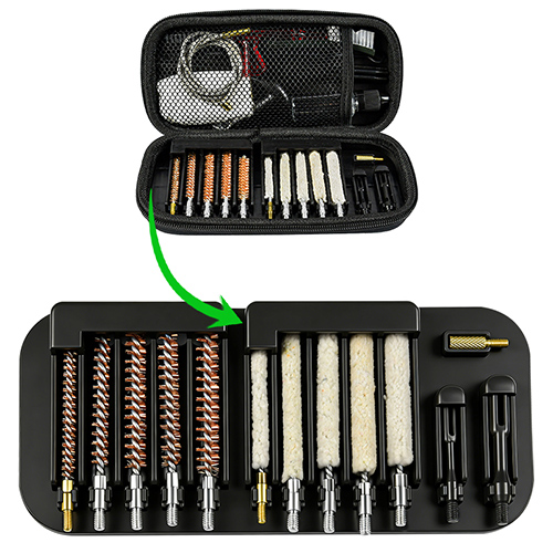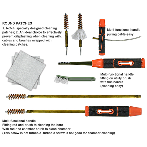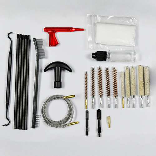 Kiväärin puhdistussarja sisältää 5 kokoa (.177, .22, .243, .27, .30 cal.), messinkiharjat ja puuvillamopit, 5 sauvaa, 2 kpl. Hiekka ja musta väri valinnat.